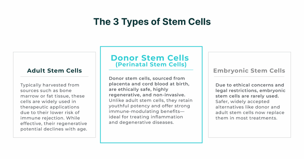 Donor Stem Cells (Perinatal Stem Cells): Sourced from placenta and umbilical cord blood, these stem cells are collected at birth without harming the baby or mother, making them ethically uncontroversial and highly effective. Unlike adult stem cells, which decline in potency with age, perinatal stem cells are young, highly regenerative, and more adaptable. They also have immune-modulating properties, which makes them ideal for treating inflammatory conditions and degenerative diseases. Because they do not require invasive harvesting procedures, they offer a safe, non-invasive, and highly potent option for regenerative therapies.