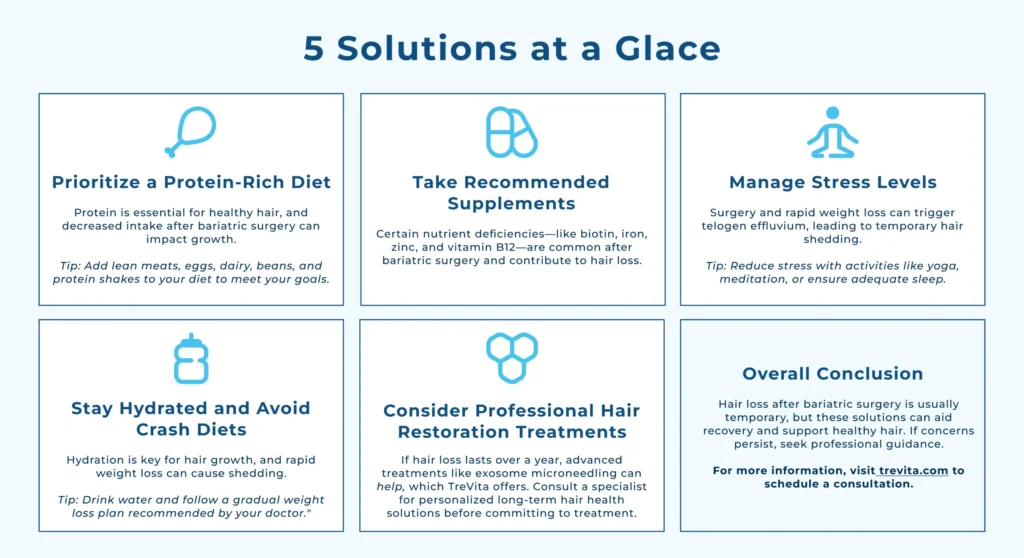 Hair loss after bariatric surgery is often temporary, but these solutions can help speed up recovery and ensure you maintain healthy hair. If you’re concerned about ongoing hair loss, don’t hesitate to seek professional guidance.